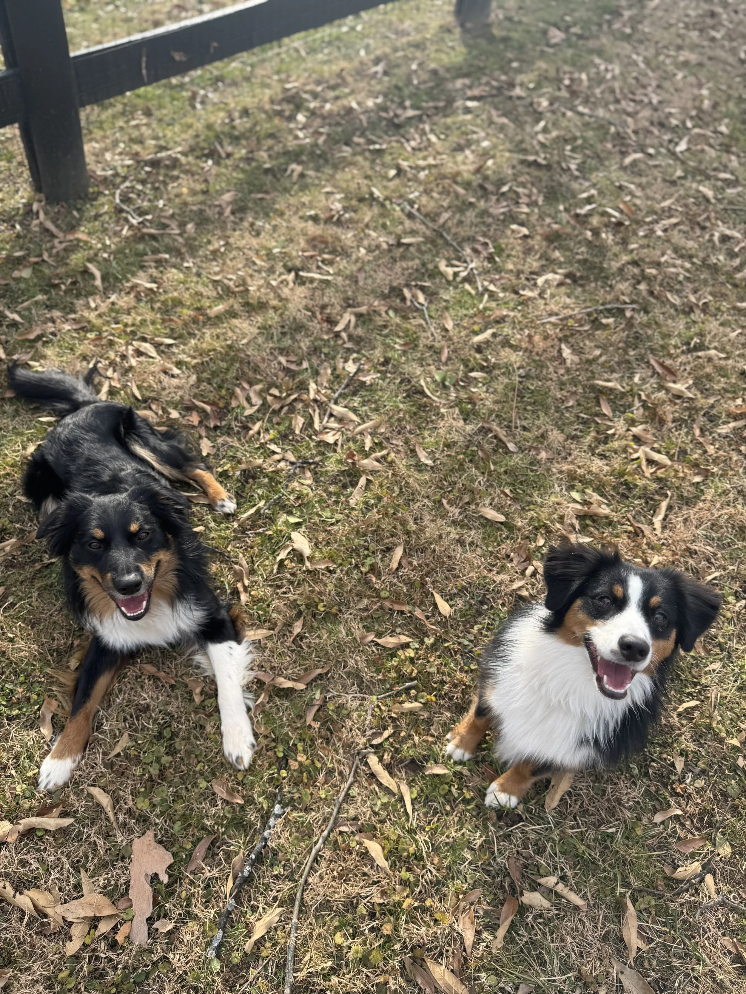 Potty breaks are every 2-4 hours in our fenced yard. Dogs also get regular walks to meet their exercise needs—either around the neighborhood or to a local hiking trail.